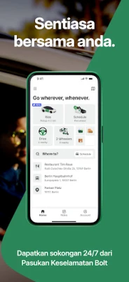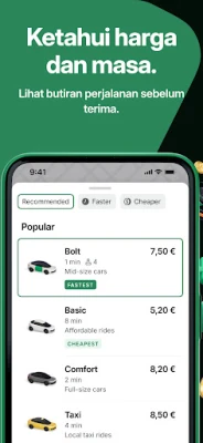 Alami kemudahan perjalanan yang tiada tandingan dengan Bolt, rakan kongsi mobiliti peribadi anda. Dari tempahan pantas dalam beberapa saat sehingga tiba di destinasi dengan selesa, Bolt menawarkan pengalaman perjalanan yang selamat dan berpatutan bersama pemandu yang berdedikasi. Dengan tambang yang jelas dipaparkan di muka hadapan dan pelbagai pilihan pembayaran fleksibel—termasuk kad kredit/debit, Apple Pay, Google Pay, serta tunai—anda sentiasa memegang kawalan penuh tanpa kejutan yang tidak diingini. Pilih daripada pelbagai kategori perjalanan—sama ada anda inginkan keselesaan, pilihan premium, kenderaan elektrik, atau ruang lebih besar dengan XL—Bolt sedia memenuhi setiap keperluan anda.
