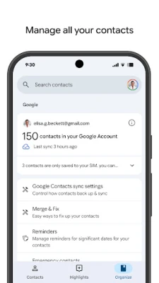 Selamatkan semua kenalan penting anda dengan penyelesaian sandaran yang teguh. Dengan aplikasi ini, anda boleh menyandarkan data kenalan anda secara automatik ke Akaun Google anda, memastikan ia kekal selamat dan terlindung daripada kehilangan. Akses senarai kenalan anda dari mana-mana peranti yang anda gunakan untuk log masuk, menjadikannya mudah untuk beralih antara telefon atau tablet baharu tanpa kerumitan. Malah jika anda terpadamkan kenalan secara tidak sengaja, anda mempunyai ketenangan fikiran untuk memulihkannya daripada folder Sampah dalam tempoh 30 hari.