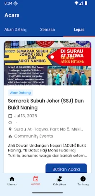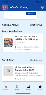Melalui myDunBukitNaning, anda akan menjadi yang pertama menerima pengumuman terkini dan berita komuniti yang penting, terus ke peranti anda. Daripada notis rasmi sehinggalah kisah kejiranan yang inspiratif, kekal celik informasi dengan hanya beberapa ketukan. Selain itu, jangan lepaskan peluang untuk mengetahui tentang pelbagai acara dan aktiviti tempatan yang sedang dan akan berlangsung. Sama ada program kesukarelaan, bengkel kemahiran, atau sambutan perayaan, myDunBukitNaning memastikan anda sentiasa dimaklumkan agar dapat merancang penyertaan anda dan berinteraksi secara aktif dalam komuniti.